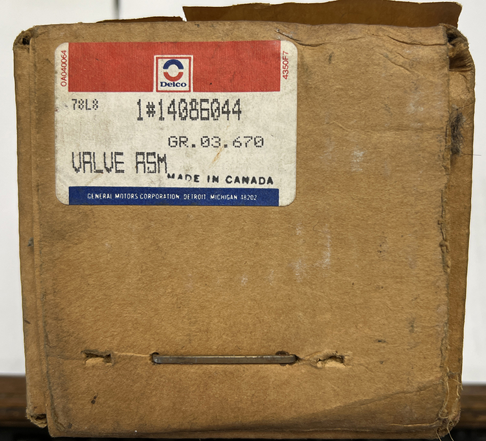 This is a NOS GM Part #14086044 Decerate Valve Assembly for 1985-1989 GM cars & trucks. This valve has been discontinued by GM. It is new in the original opened box. Valve was made in Canada.