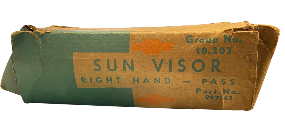 LIMITED SUPPLY! Only one visor available. This is a NOS GM Accessory RIGHT Side Sun Visor & Bracket for 1955 Series 150 Station Wagon Model 1263F. Visor comes with mounting & pivoting bracket. The visor is in excellent condition but the original box is rough. GM# 987143